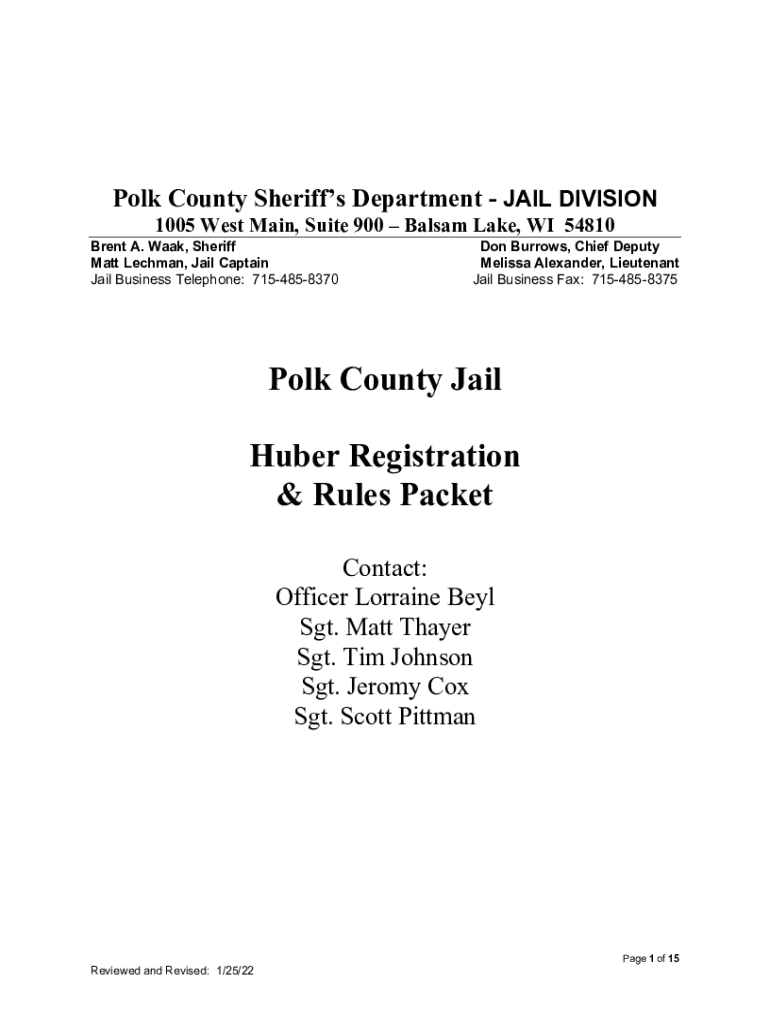 Polk County Sheriffs Department JAIL DIVISION 1005 West Main, Suite 900 Balsam Lake, WI 54810Brent A. Walk, Sheriff Matt Lehman, Jail Captain Jail Business Telephone: 7154858370Don Burrows, Chief