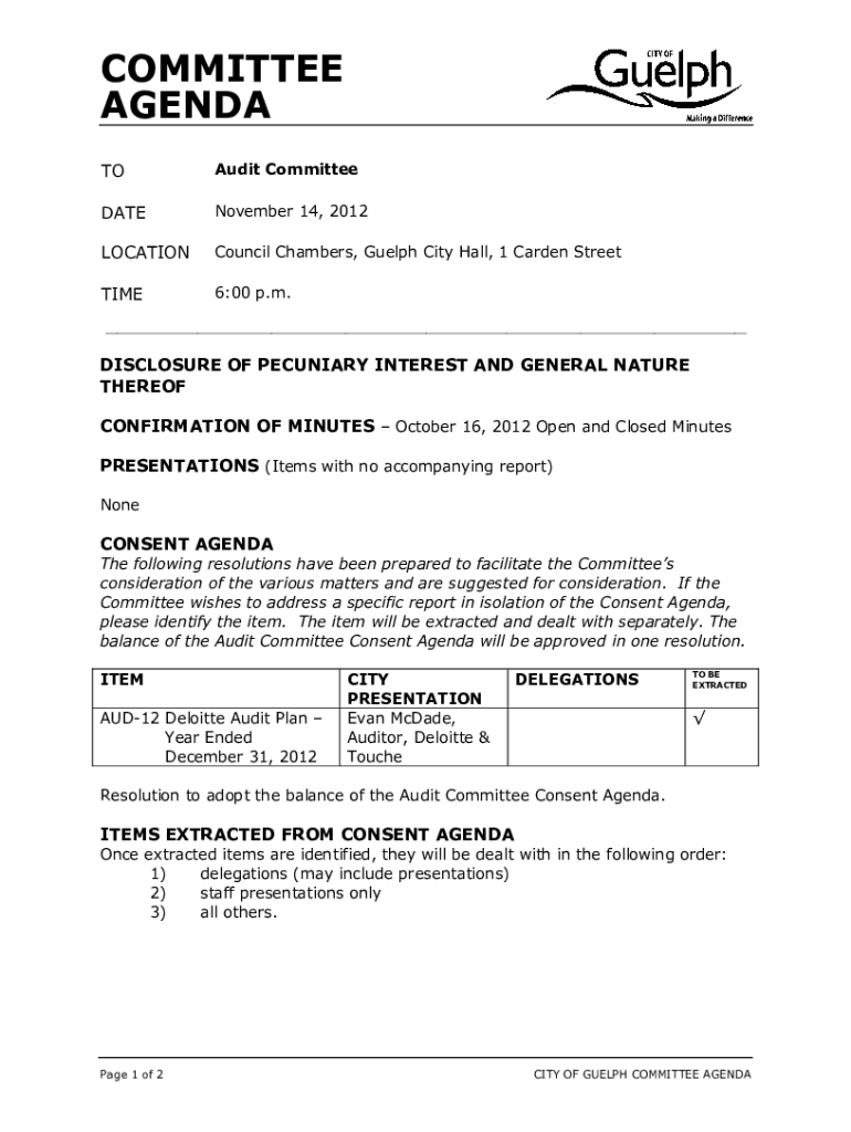 COMMITTEE AGENDA Audit CommitteeDATENovember 14, 2012LOCATIONCouncil Chambers, Guelph City Hall, 1 Garden StreetTIME6:00 p.m.___DISCLOSURE OF PECUNIARY INTEREST AND GENERAL NATURE THEREOF CONFIRMATION