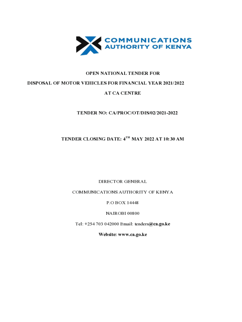 OPEN NATIONAL TENDER FOR DISPOSAL OF MOTOR VEHICLES FOR FINANCIAL YEAR 2021/2022 AT CA CENTRETENDER NO: CA/PRO/OT/DIS/02/20212022TENDER CLOSING DATE: 4TH MAY 2022 AT 10:30 DIRECTOR GENERAL COMMUNICATIONS