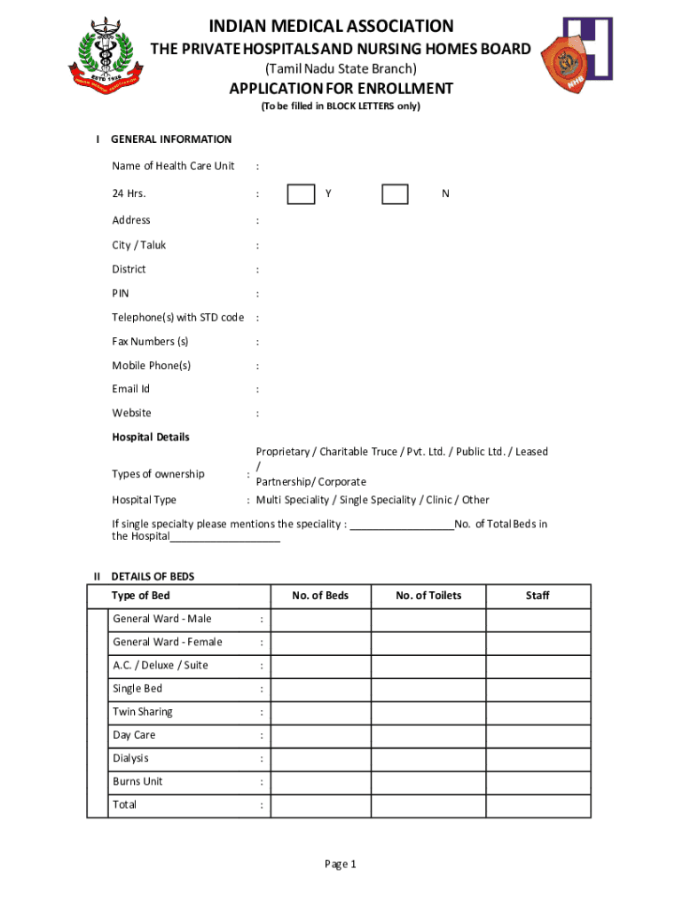 INDIAN MEDICAL ASSOCIATION THE PRIVATEHOSPITALS AND NURSING HOMES BOARD (Tamil Nadu State Branch)APPLICATION FOR ENROLLMENT (To be filled in BLOCK LETTERS only)GENERAL INFORMATION Name of Health Care