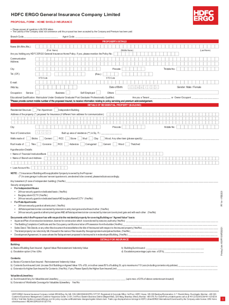 HDFC ERGO General Insurance Company Limited PROPOSAL FORM HOME SHIELD INSURANCE Please answer all questions in BLOCK letters The Liability of the Company does not commence until this proposal has