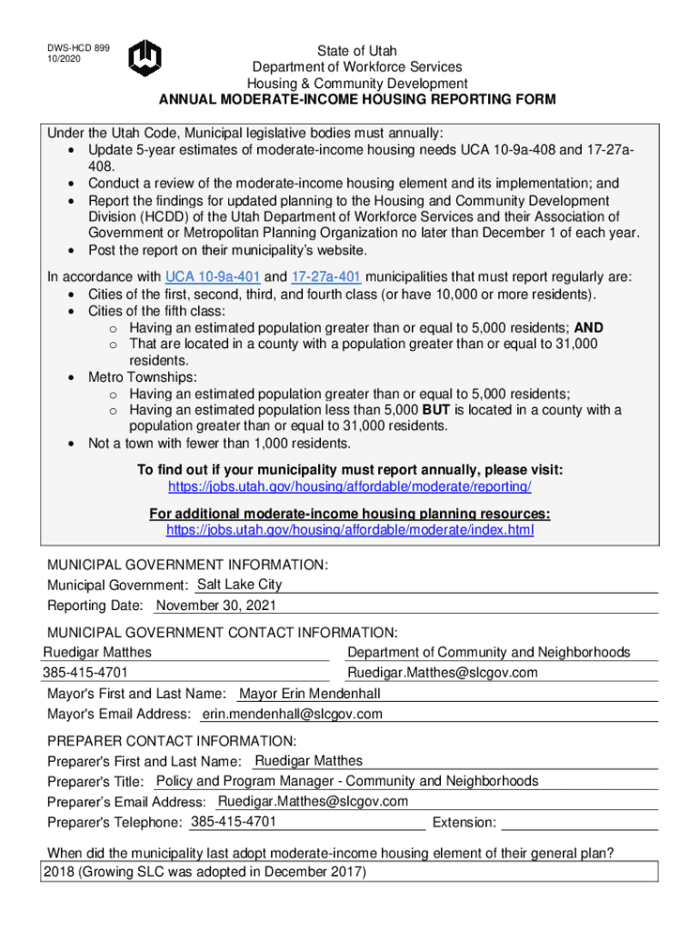 DASHED 899 10/2020State of Utah Department of Workforce Services Housing & Community Development ANNUAL MODERATEINCOME HOUSING REPORTING Founder the Utah Code, Municipal legislative bodies must annually: