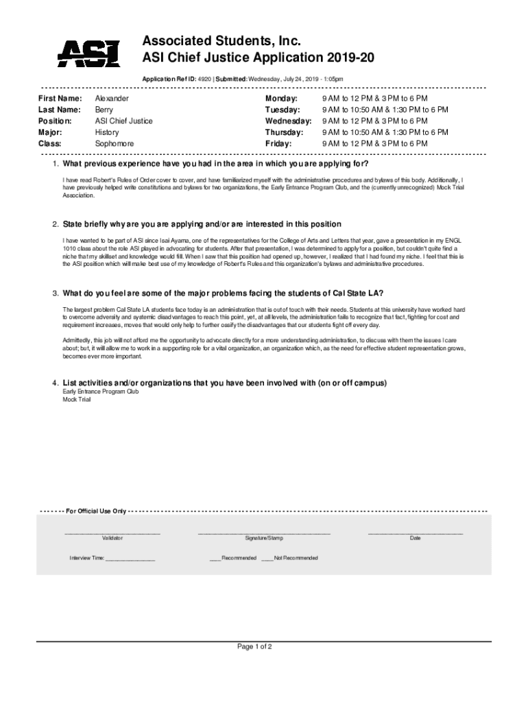 Associated Students, Inc. AS Chief Justice Application 201920 Application Ref ID: 4920 | Submitted: Wednesday, July 24, 2019 1:05pm First Name: Last Name: Position: Major: Class:Alexander Berry AS