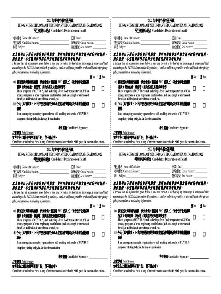 2022 HONG KONG DIPLOMA OF SECONDARY EDUCATION EXAMINATION 2022 Candidates Declaration on Health Name of Candidate: Date: Candidate Number: Center Number: ___ Subject: Seat Number: ___ ____________I