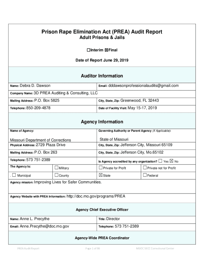 Prison Rape Elimination Act (AREA) Audit Report Adult Prisons & Jails Interim Final Date of Report June 29, 2019Auditor Information Name: Debra. DawsonCompany Name: 3DEmail:dddawsonprofessionalaudits@gmail.complex