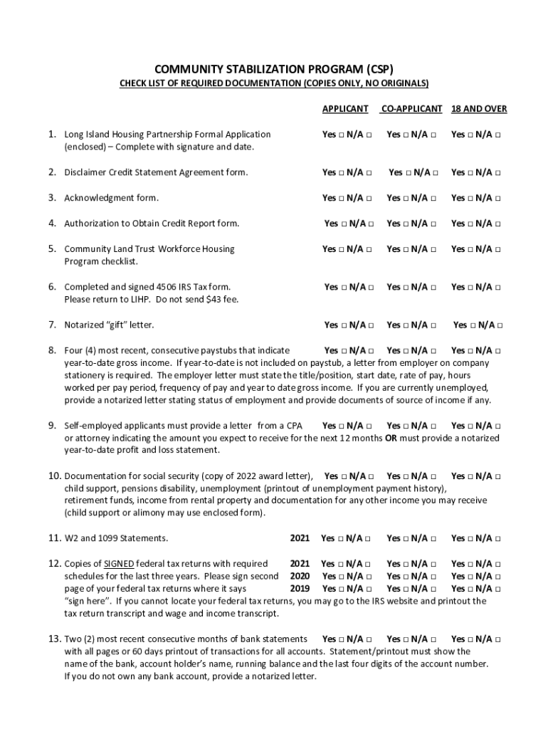 COMMUNITY STABILIZATION PROGRAM (CSP)CHECK LIST OF REQUIRED DOCUMENTATION (COPIES ONLY, NO ORIGINALS) APPLICANTCOAPPLICANT 18 AND OVER1. Long Island Housing Partnership Formal Applications N/A Yes