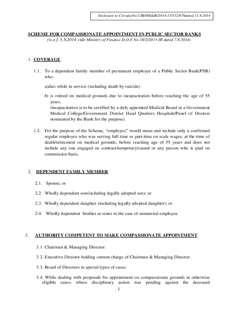 Enclosure to CircularNo.CIR/HR&IR/201415/532/476dated 11.8.2014SCHEME FOR COMPASSIONATE APPOINTMENT IN PUBLIC SECTOR BANKS (w.e.f. 5.8.2014 vide Ministry of Finance D.O.F. No.18/2/2013IR dated 7.8.2014)1.