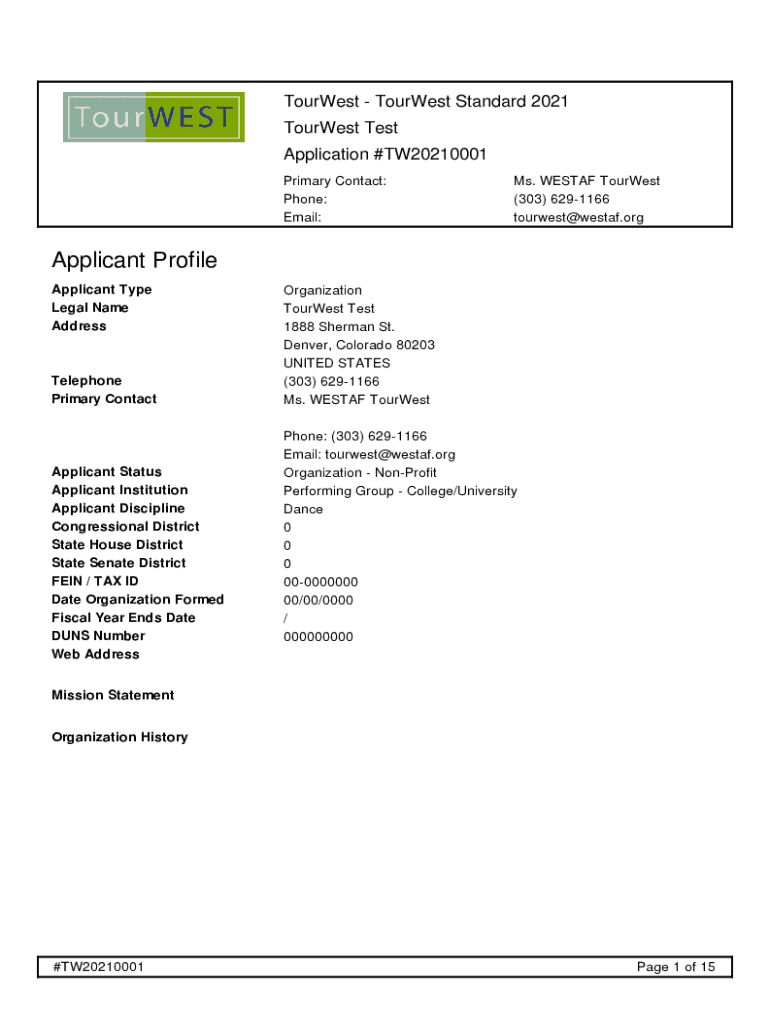 Tour West Standard 2021 Tour West Test Application #TW20210001 Primary Contact: Phone: Email:Ms. WEST AF Tour West (303) 6291166 tourwest@westaf.orgApplicant Profile Applicant Type Legal Name AddressTelephone
