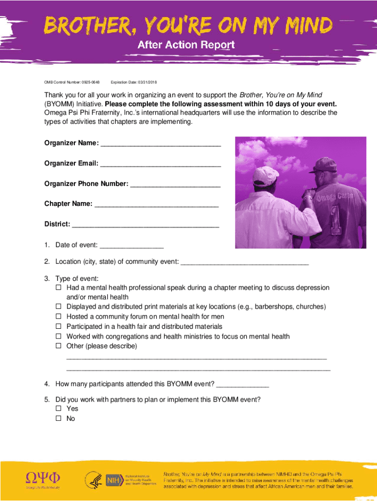 OMB Control Number: 09250648Expiration Date: 03/31/2018Thank you for all your work in organizing an event to support the Brother, You're on My Mind (BY OMM) Initiative. Please complete the following