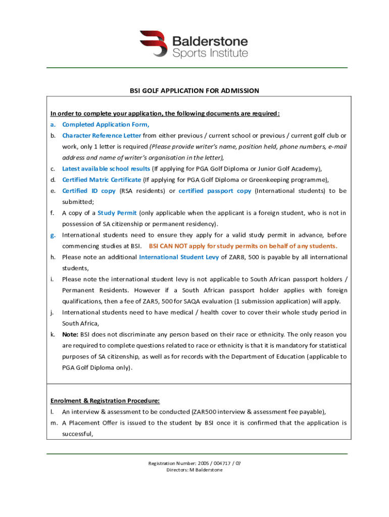 Get the free BSI GOLF APPLICATION FOR ADMISSION