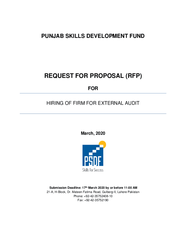 PUNJAB SKILLS DEVELOPMENT FUNDREQUEST FOR PROPOSAL (RFP) FOR HIRING OF FIRM FOR EXTERNAL AUDIT March, 2020Submission Deadline: 17th March 2020 by or before 11:00 AM 21A, Block, Dr. Sateen Fatima Road,