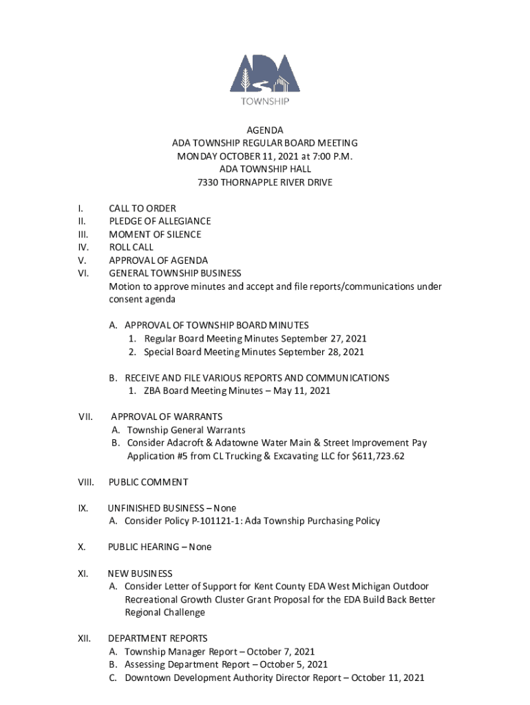 AGENDA ADA TOWNSHIP REGULAR BOARD MEETING MONDAY, OCTOBER 11, 2021, at 7:00 P.M. ADA TOWNSHIP HALL 7330 THORNAPPLE RIVER DRIVE I. II. III. IV. V. VI.CALL TO ORDER PLEDGE OF ALLEGIANCE MOMENT OF SILENCE