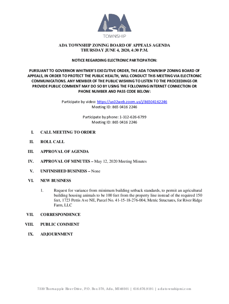 ADA TOWNSHIP ZONING BOARD OF APPEALS AGENDA THURSDAY, JUNE 4, 2020, 4:30 P.M. NOTICE REGARDING ELECTRONIC PARTICIPATION: PURSUANT TO GOVERNOR WHITMER EXECUTIVE ORDER, THE ADA TOWNSHIP ZONING BOARD