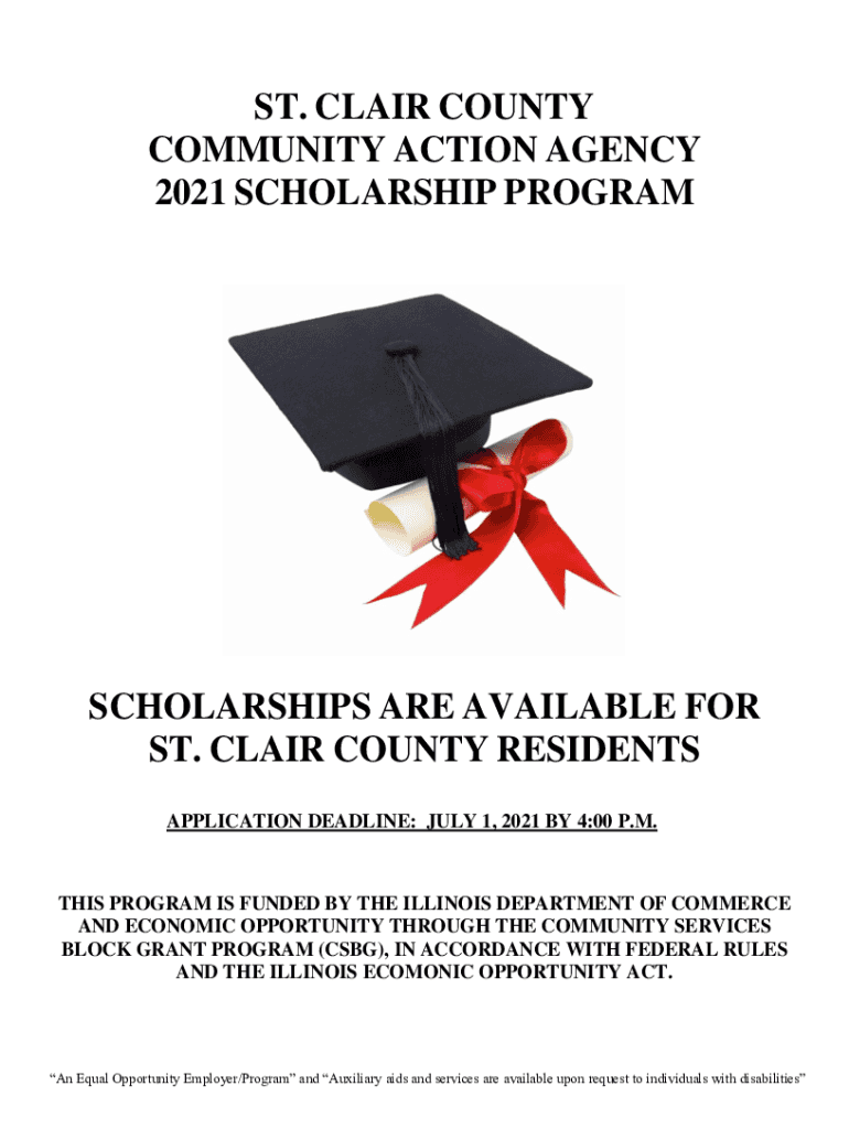 ST. CLAIR COUNTY COMMUNITY ACTION AGENCY 2021 SCHOLARSHIP PROGRAMSCHOLARSHIPS ARE AVAILABLE FOR ST. CLAIR COUNTY RESIDENTS APPLICATION DEADLINE: JULY 1, 2021, BY 4:00 P.M.THIS PROGRAM IS FUNDED BY