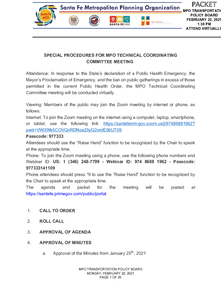 PACKET TRANSPORTATION POLICY BOARD FEBRUARY 22, 2021 1:30 PM ATTEND VIRTUALLYSPECIAL PROCEDURES FOR MPH TECHNICAL COORDINATING COMMITTEE MEETING Attendance: In response to the States declaration of