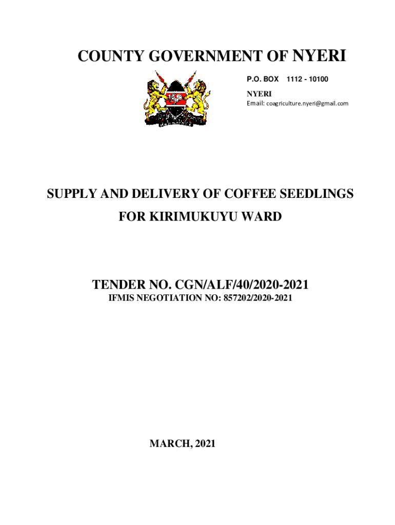 COUNTY GOVERNMENT OF MYERS P.O. BOXTI1112 10100NYERI Email: coagriculture.nyeri@gmail.comSUPPLY AND DELIVERY OF COFFEE SEEDLINGS FOR KIRIMUKUYU BARTENDER NO. CGN/ALF/40/20202021 IFM IS NEGOTIATION