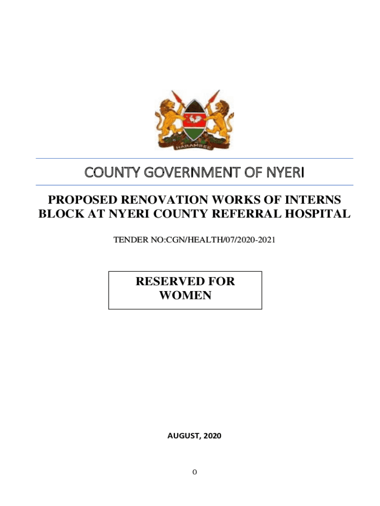 COUNTY GOVERNMENT OF MYERS PROPOSED RENOVATION WORKS OF INTERNS BLOCK AT MYERS COUNTY REFERRAL HOSPITAL TENDER NO:CGN/HEALTH/07/20202021RESERVED FOR WOMENAUGUST, 20200PROPOSED RENOVATION WORKS OF