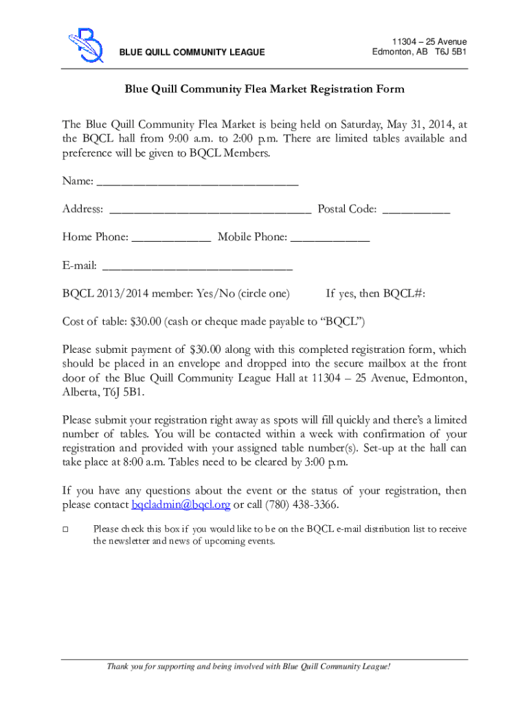 11304 25 Avenue Edmonton, AB T6J 5B1BLUE QUILL COMMUNITY LEAGUEBlue Quill Community Flea Market Registration Form The Blue Quill Community Flea Market is being held on Saturday, May 31, 2014, at the
