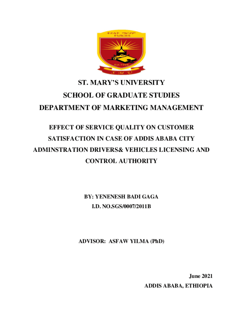 ST. MARY UNIVERSITY SCHOOL OF GRADUATE STUDIES DEPARTMENT OF MARKETING MANAGEMENT EFFECT OF SERVICE QUALITY ON CUSTOMER SATISFACTION IN CASE OF ADDIS ABABA CITY ADMINISTRATION DRIVERS VEHICLES LICENSING