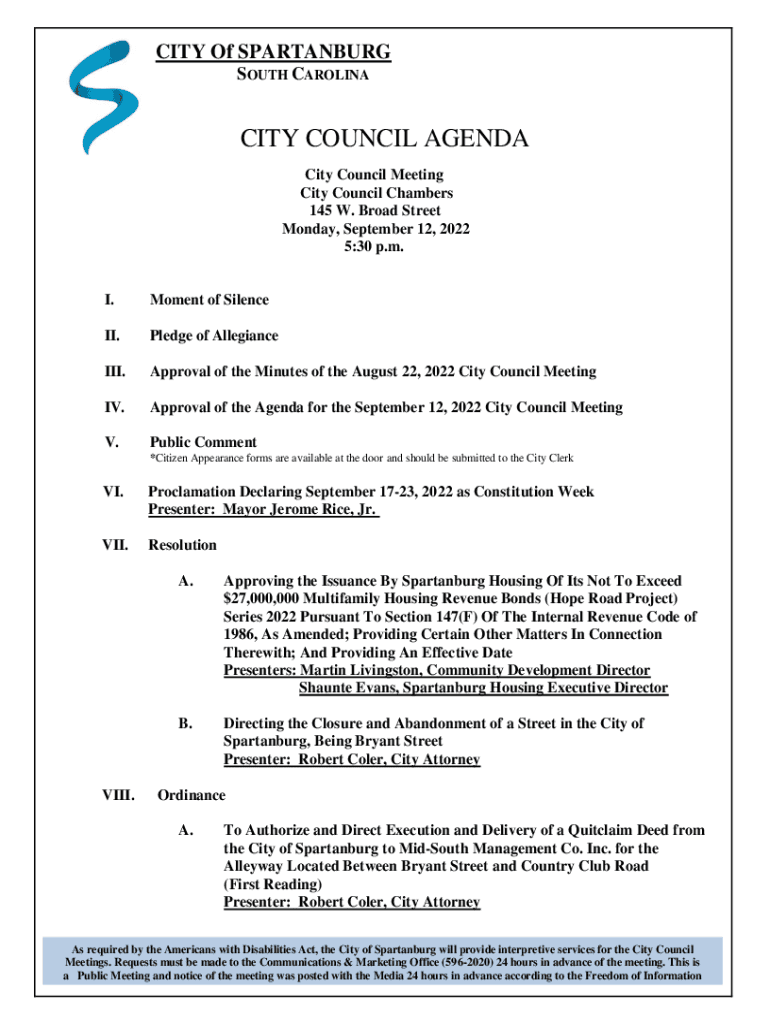 CITY Of SPARTANBURG SOUTH CARDINALITY COUNCIL AGENDA City Council Meeting City Council Chambers 145 W. Broad Street Monday, September 12, 2022 5:30 p.m.I. Moment of Silence. Pledge of Allegiance.