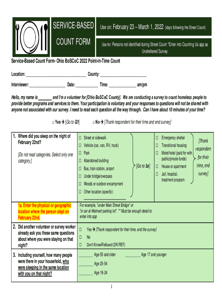 SERVICEBASED COUNT Forms on: February 23 March 1, 2022 (days following the Street Count) Use for: Persons not identified during Street Count *Enter into Counting Us app asUnsheltered SurveyServiceBased
