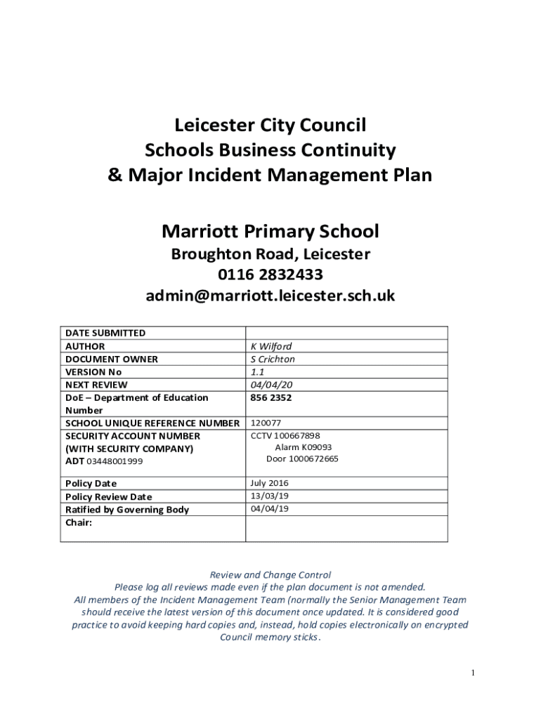 Leicester City Council Schools Business Continuity & Major Incident Management Plan Marriott Primary School Brought on Road, Leicester 0116 2832433 admin@marriott.leicester.sch.uk DATE SUBMITTED AUTHOR