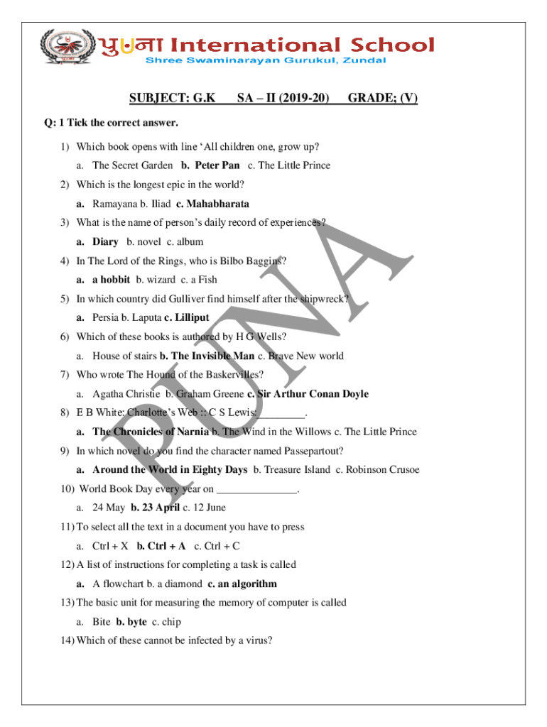 SUBJECT: G.KSA II (201920)GRADE; (V)Q: 1 Tick the correct answer. 1) Which book opens with line All children one, grow up? a. The Secret Garden b. Peter Pan c. The Little Prince 2) Which is the longest