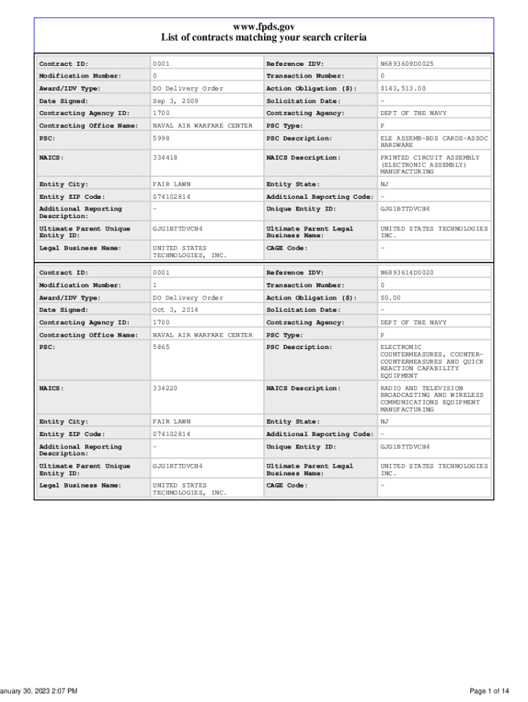 WWW.PDS.gov List of contracts matching your search criteria Contract ID:0001Reference ID:N6893609D0025Modification Number:0Transaction Number:0Award/ID Type:DO Delivery Operation Obligation ($):$143,513.00Date