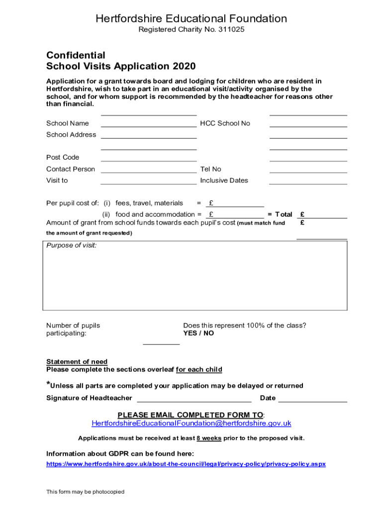 Hertfordshire Educational Foundation Registered Charity No. 311025Confidential School Visits Application 2020 Application for a grant towards board and lodging for children who are resident in Hertfordshire,