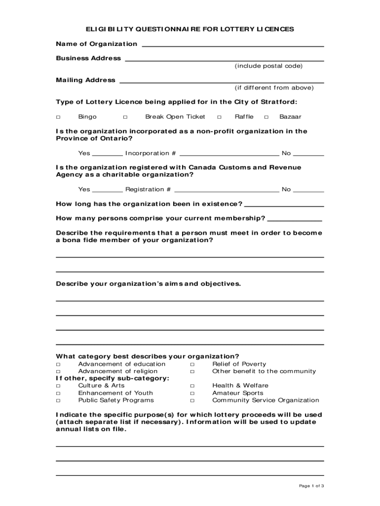 ELIGIBILITY QUESTIONNAIRE FOR LOTTERY Licenses