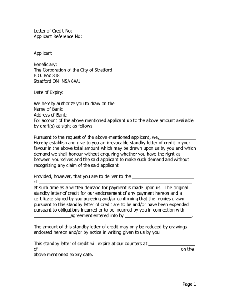 Letter of Credit No: Applicant Reference No: Applicant Beneficiary: The Corporation of the City of Stratford P.O. Box 818 Stratford ON N5A 6W1 Date of Expiry: We hereby authorize you to draw on the