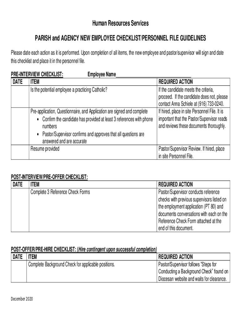 Human Resources Services PARISH and AGENCY NEW EMPLOYEE CHECKLIST/PERSONNEL FILE GUIDELINES Please date each action as it is performed. Upon completion of all items, the new employee and pastor/supervisor