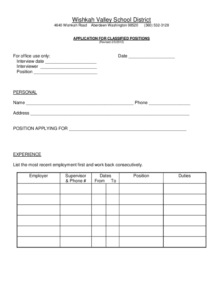 Mishkan Valley School District 4640 Mishkan Road Aberdeen Washington 98520(360) 5323128APPLICATION FOR CLASSIFIED POSITIONS (Revised 2/5/2012)For office use only: Interview date ___ Interviewer ___