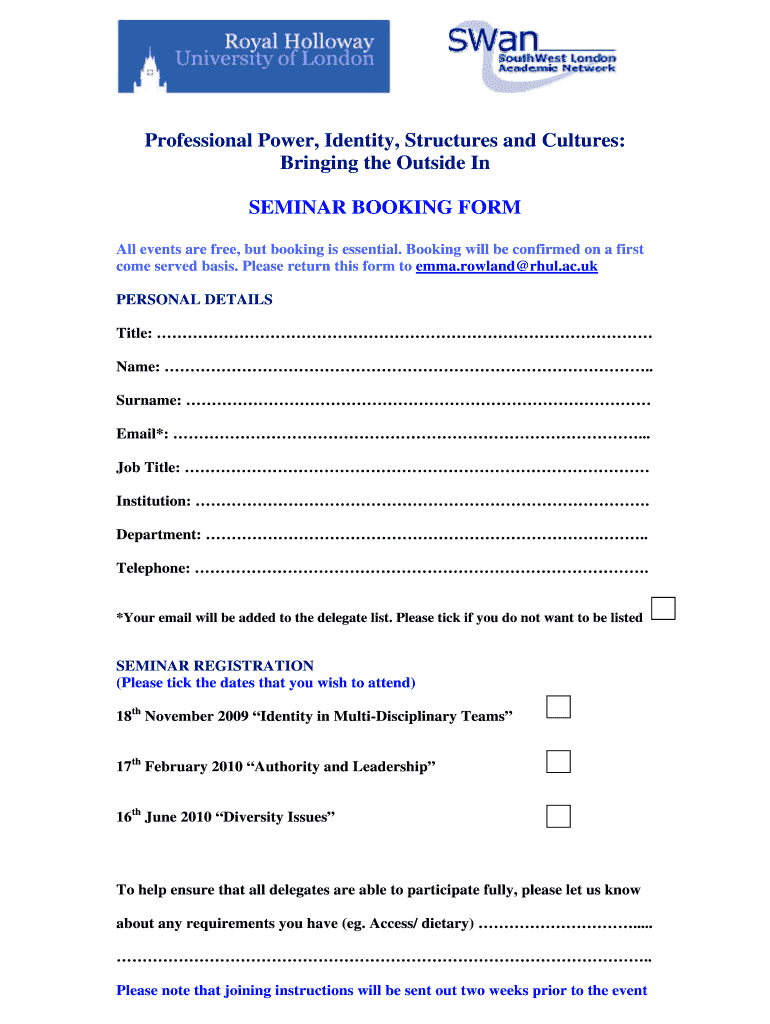 Get the free Bringing the Outside In SEMINAR BOOKING FORM - Royal Holloway