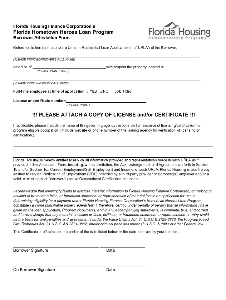 Florida Housing Finance Corporations Florida Hometown Heroes Loan Program Borrower Attestation Form Reference is hereby made to the Uniform Residential Loan Application (the UCLA) of the Borrower,