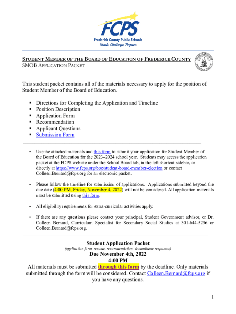 STUDENT MEMBER OF THE BOARD OF EDUCATION OF FREDERICK COUNTY MOB APPLICATION PACKET This student packet contains all the materials necessary to apply for the position of Student Member of the Board