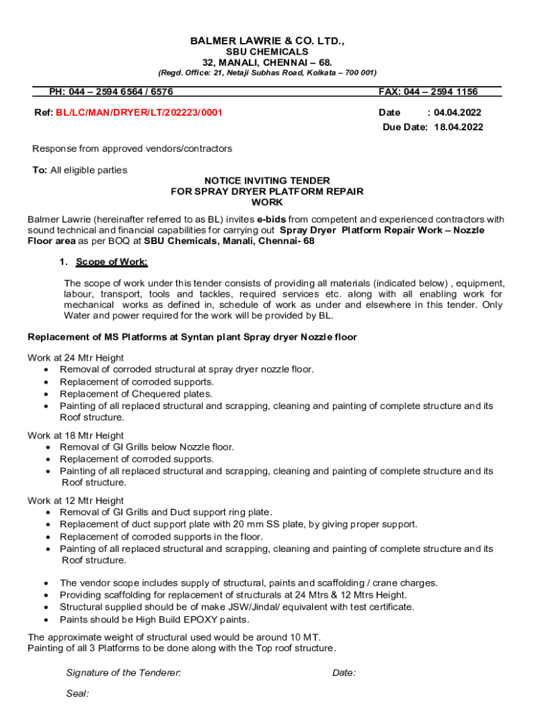 PALMER LAURIE & CO. LTD., SBS CHEMICALS 32, CANAL, CHENNAI 68.(Red. Office: 21, Nepali Subhash Road, Kolkata 700 001)PH: 044 2594 6564 / 6576FAX: 044 2594 1156Ref: BL/LC/MAN/DRYER/LT/202223/0001Date: