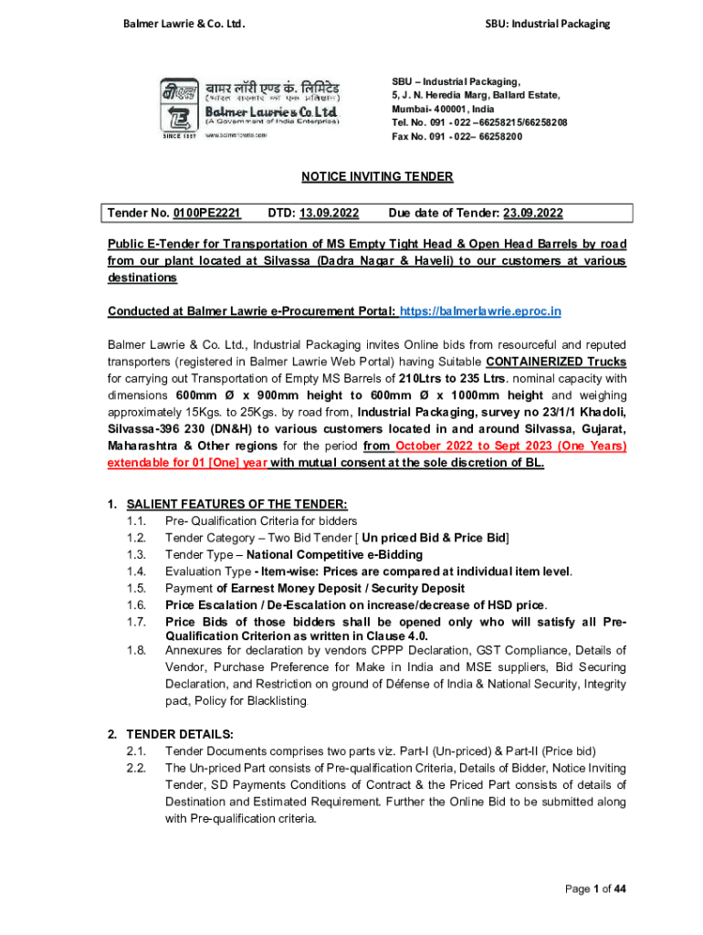 Palmer Laurie & Co. Ltd.SBS: Industrial Packaging, 5, J. N. Hardin Mary, Ballard Estate, Mumbai 400001, India Tel. No. 091 022 66258215/66258208 Fax No. 091 022 66258200NOTICE INVITING TENDER No.