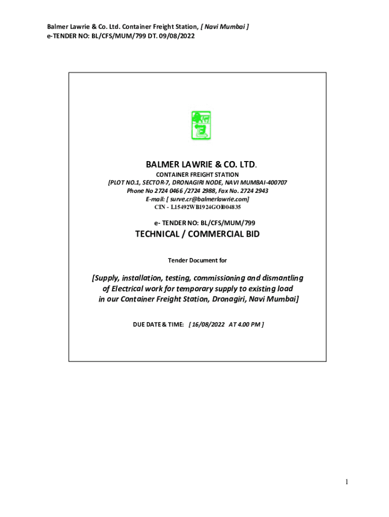 Palmer Laurie & Co. Ltd. Container Freight Station, [Navi Mumbai] tender NO: BL/CFS/MUM/799 DT. 09/08/2022BALMER LAURIE & CO. LTD.CONTAINER FREIGHT STATION [PLOT NO.1, SECTOR7, DRONAGIRI NODE, NAVY