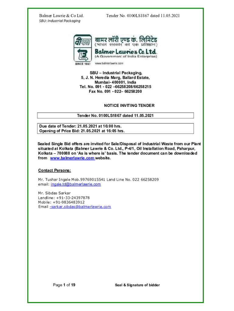 Palmer Laurie & Co Ltd. Tender No. 0100LS1867 dated 11.05.2021SBU: Industrial Packaging, 5, J. N. Hardin Mary, Ballard Estate, Mumbai 400001, India Tel. No. 091 022 66258208/66258215 Fax No. 091 022