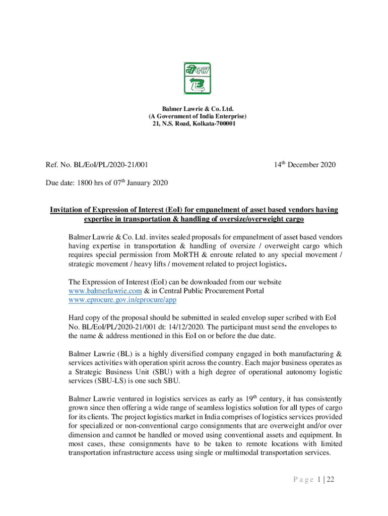 Palmer Laurie & Co. Ltd. (A Government of India Enterprise) 21, N.S. Road, Kolkata700001Ref. No. BL/EOI/PL/202021/00114th December 2020Due date: 1800 hrs of 07th January 2020Invitation of Expression