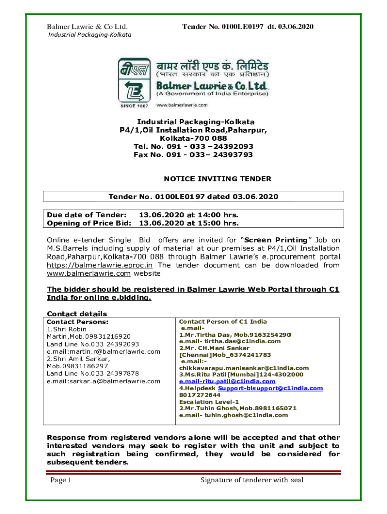 Get the free Balmer Lawrie & Co Ltd. Tender No. 0100LE0197 dt. 03.06 ...