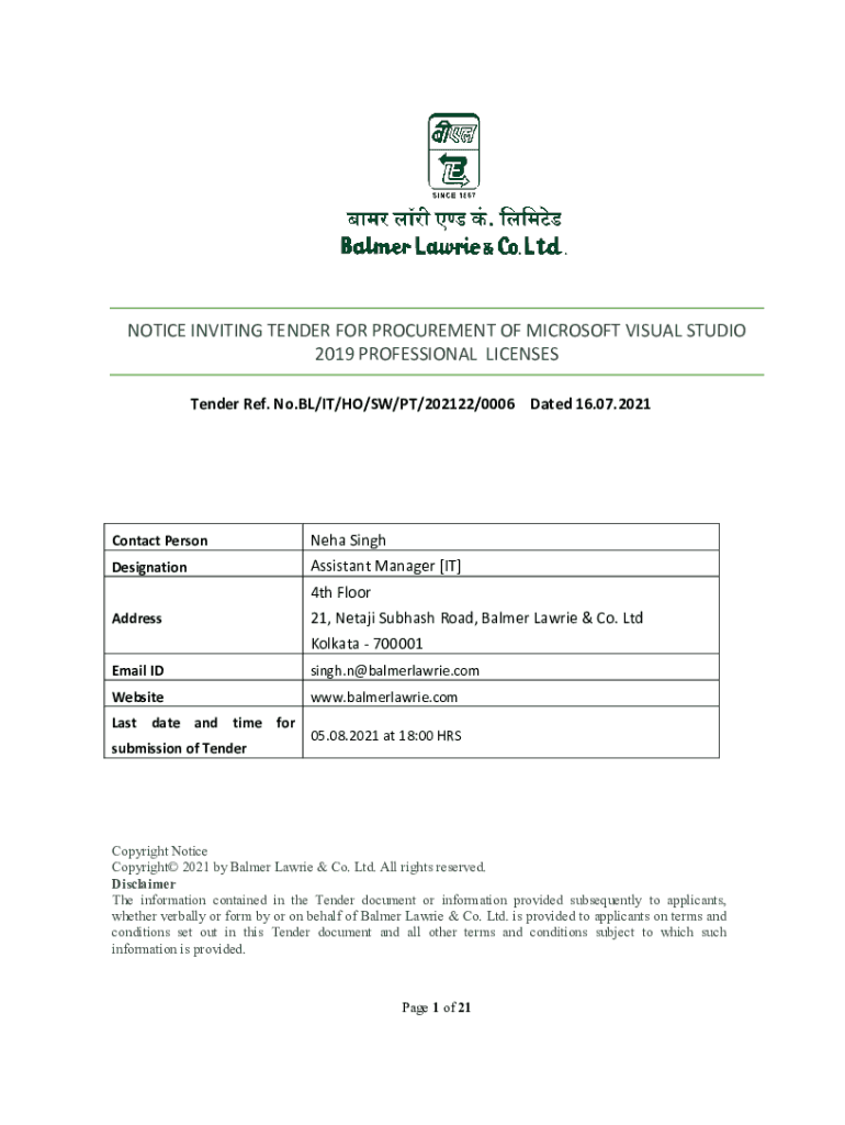 NOTICE INVITING TENDER FOR PROCUREMENT OF MICROSOFT VISUAL STUDIO 2019 PROFESSIONAL LICENSES Tender Ref. No.BL/IT/HO/SW/PT/202122/0006 Dated 16.07.2021Contact Personnel SinghDesignationAssistant Manager