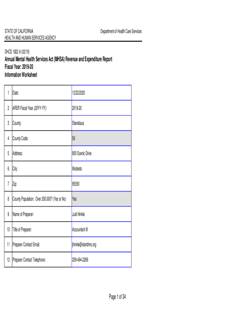 STATE OF CALIFORNIA HEALTH AND HUMAN SERVICES AGENCYDepartment of Health Care ServicesDHCS 1822 A (02/19)Annual Mental Health Services Act (MESA) Revenue and Expenditure Report Fiscal Year: 201920