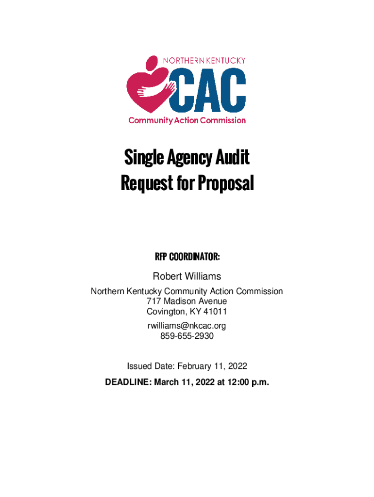 Single Agency Audit Request for Proposal RFP COORDINATOR:Robert Williams Northern Kentucky Community Action Commission 717 Madison Avenue Covington, KY 41011 rwilliams@nkcac.org 8596552930Issued Date: