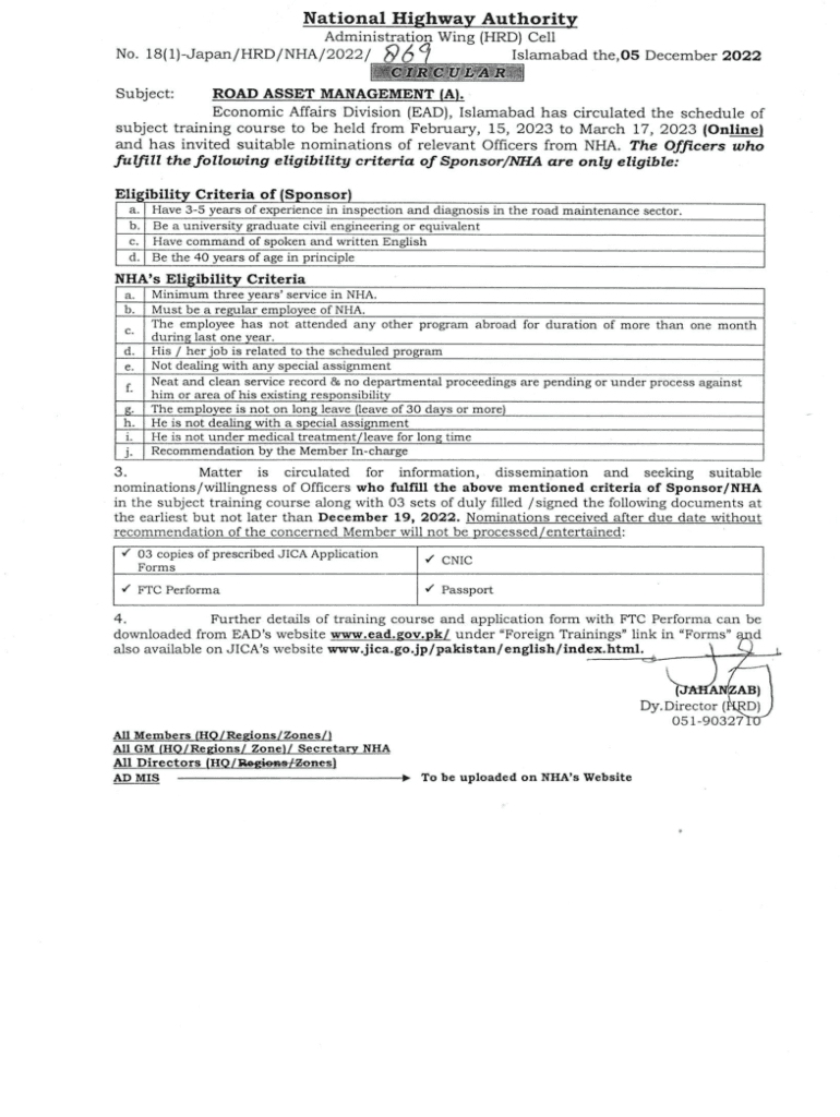 National Highway Authority Administration Wing (HRD) Cell No. 18(l)Japan/HRD/NHA/2022/^2 Islamabad the,05 December 2022Subject:ROAD ASSET MANAGEMENT (A). Economic Affairs Division (EAD), Islamabad