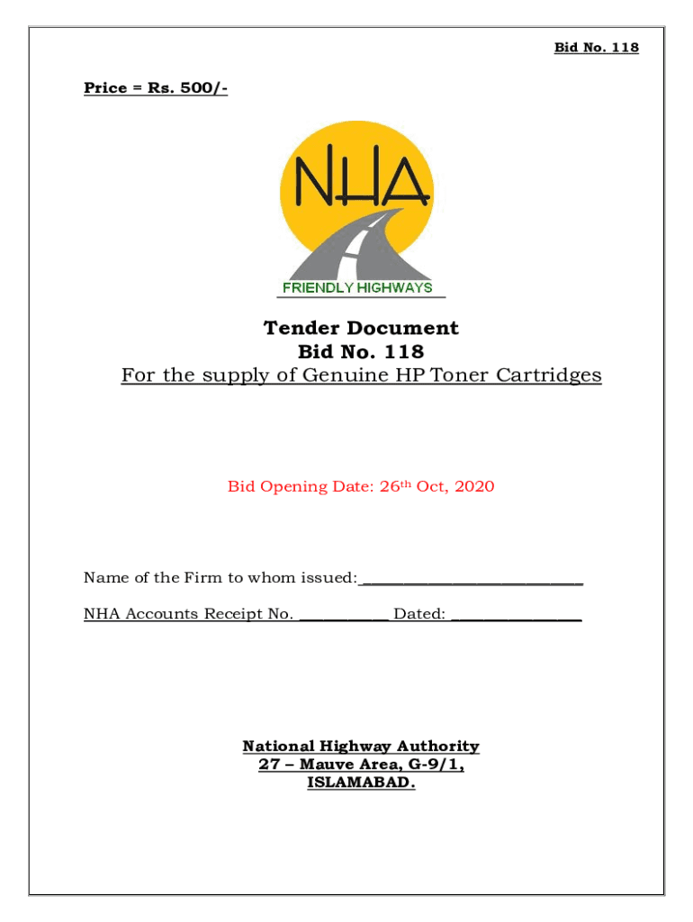 For the supply of Genuine HP Toner Cartridges Opening Date: 26th Oct, 2020Name of the Firm to whom issued: ___