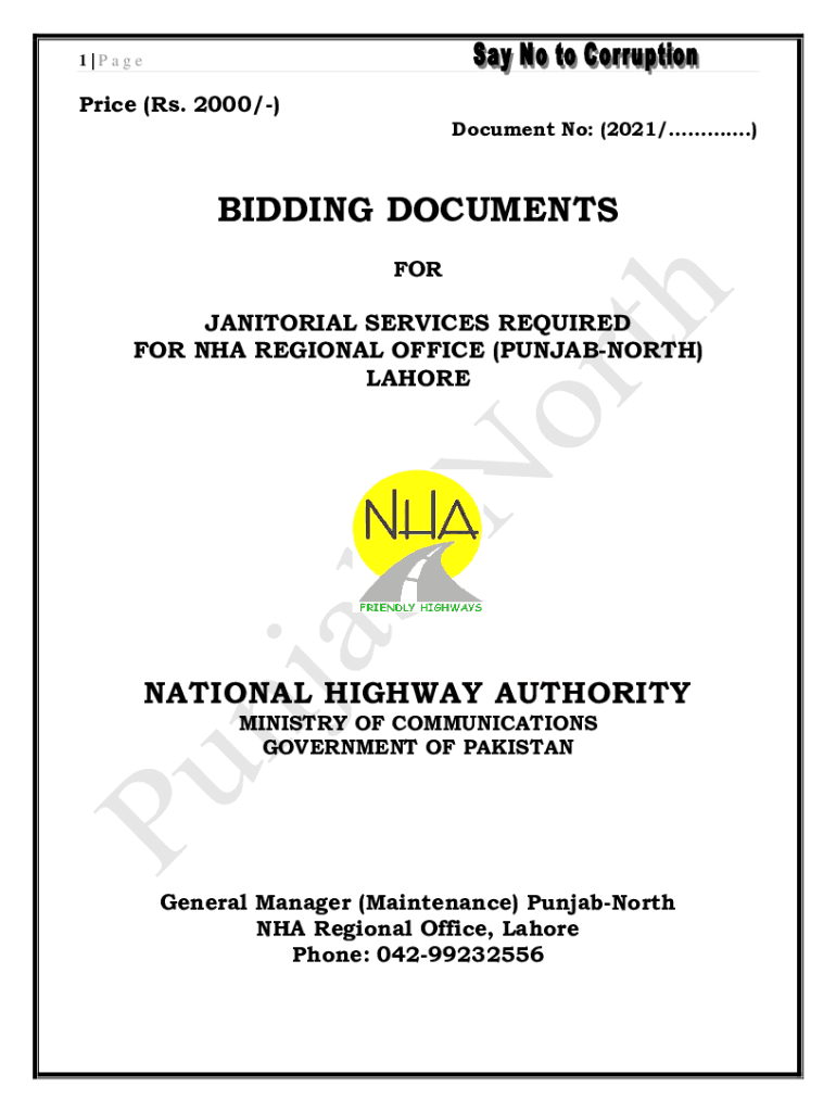 1|Page Price (Rs. 2000/) Document No: (2021/.)BIDDING DOCUMENTS JANITORIAL SERVICES REQUIRED FOR NHA REGIONAL OFFICE (PUNJABNORTH) LAHORENATIONAL HIGHWAY AUTHORITY MINISTRY OF COMMUNICATIONS GOVERNMENT