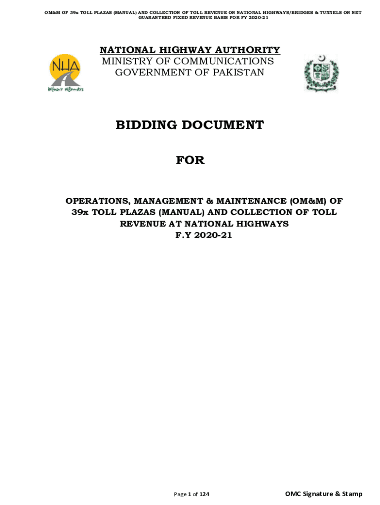 OMM OF 39x TOLL PLAZAS (MANUAL) AND COLLECTION OF TOLL REVENUE ON NATIONAL HIGHWAYS/BRIDGES & TUNNELS ON NET GUARANTEED FIXED REVENUE BASIS FOR FY 202021NATIONAL HIGHWAY AUTHORITY MINISTRY OF COMMUNICATIONS