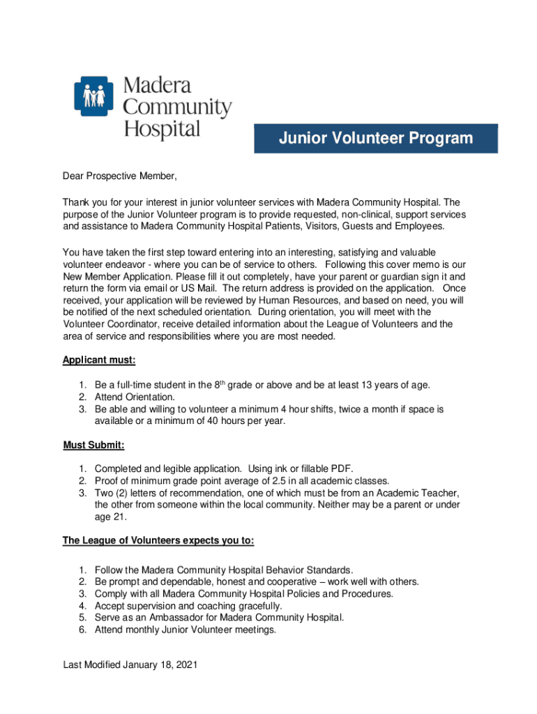 Junior Volunteer Program Dear Prospective Member, Thank you for your interest in junior volunteer services with Madera Community Hospital. The purpose of the Junior Volunteer program is to provide
